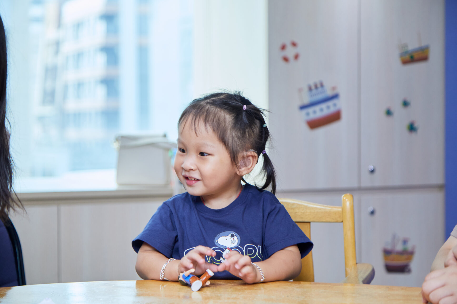 三歲的小安在雅文基金會的教室裡,聽到聲音後大聲地複誦,接著套下一個又一個的圈圈玩具。這短短的課中時光,是在雅文基金會的聽損孩子反覆練習「雅文檢測音註1辨識」後的成果——這一切的起點,都始於一個看似簡單,卻又至關重要的能力,孩子得先學會安靜,讓耳朵準備好,才可以讓家長、老師更即時了解孩子聽能狀況。