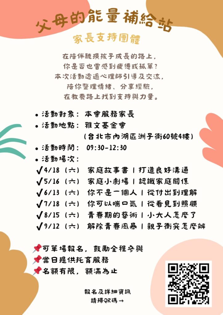 陪伴聽損孩子成長是一場馬拉松,家長的心理健康是孩子最有力的後盾。2026年「父母能量補給站」家長支持團體正式啟動,由專業心理師帶領,針對溝通模式、家庭關係、自我照顧及青春期親子衝突等六大核心主題,提供深度的情緒整理與經驗分享空間。本計畫專為聽損家庭設計,旨在透過同儕支持與專家引導,協助家長在疲憊的教養路上找回力量,建立更緊密的家庭連結。無論您正處於早療期的迷惘,或面臨孩子青春期的挑戰,這裡將是您最溫暖的心理避風港。