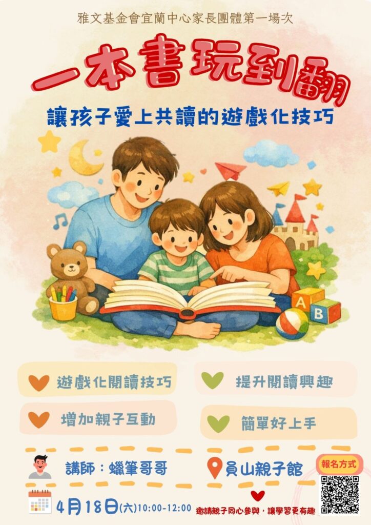 | 第一場 | 04月18日(六) 10:00-12:00 | 一本書玩到翻:讓孩子愛上共讀的遊戲化技巧 | 讓家長學習至少 3 項可立即運用的遊戲化共讀方法。藉由在閱讀中加入遊戲元素,提升孩子的閱讀興趣、增加參與度,同時促進親子之間的互動與情感連結。 | 員山親子館 | 蠟筆哥哥 姚伯勳 | 有 |