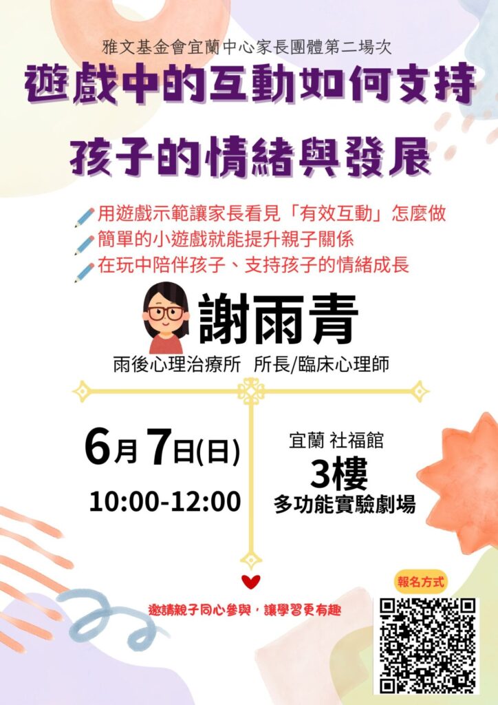 | 第二場 | 6月7日(日) 10:00-12:00 | 遊戲中的互動如何支持孩子的情緒與發展 | 透過遊戲示範與心理師講解,協助家長理解在遊戲中「有效互動」的具體做法,透過簡單可行的遊戲陪伴技巧以提升親子關係、增進互動品質。 | 社福館 3樓多功能實驗劇場 | 謝雨青 雨後心理治療所 所長/臨床心理師 | 有 |