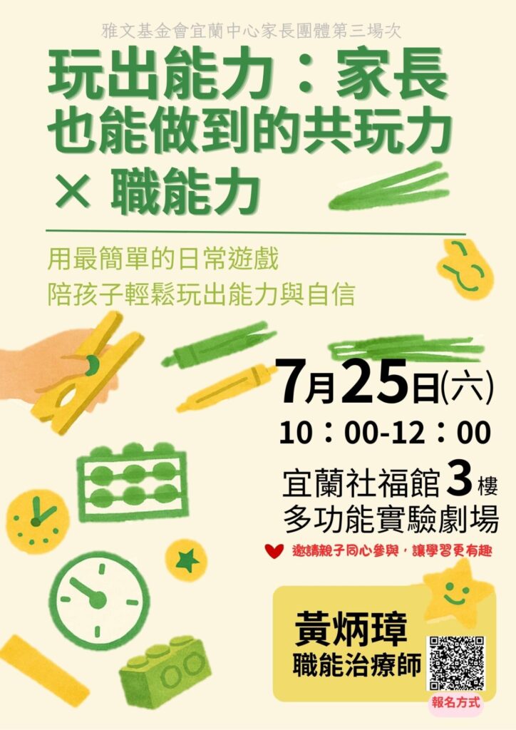 | 第三場 | 7月25日(六) 10:00-12:00 | 玩出能力:家長也能做到的共玩力 × 職能力 | 透過示範日常化的遊戲方式,讓家長感受到「家裡就能玩、有工具就能做」,藉由降低遊戲門檻,幫助家長建立正向、輕鬆的陪伴心態,減少育兒焦慮,同時提升家長在陪玩與互動中的自信感。 | 社福館 3樓多功能實驗劇場 | 黃炳璋 職能治療師 | 有 |
