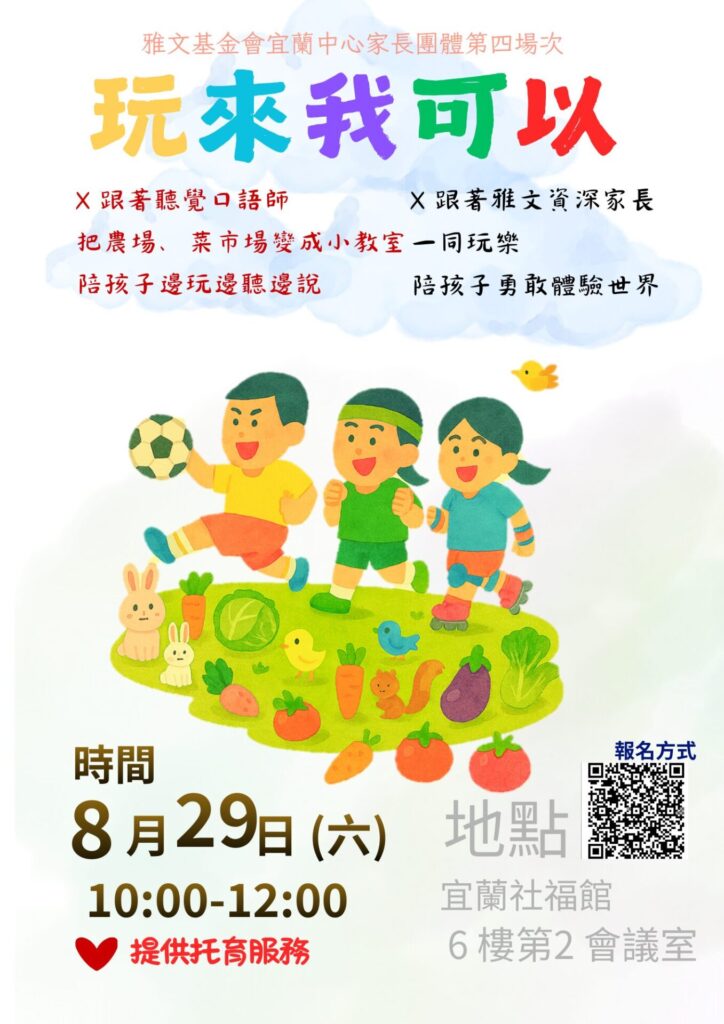 | 第四場 | 8月29日(六) 10:00-12:00 | 玩來我可以:跟著雅文資深家長一起學,陪伴孩子好好玩 | 建立家長正向且輕鬆的陪伴心態,透過支持性的分享與交流,讓家長在育兒旅程中獲得鼓勵與力量。同時提供新手家長與資深家長互相交流與彼此支持的機會,形成溫暖、實用的育兒互助網絡。 | 社福館 6樓第2會議室 | 聽覺口語師 本會資深家長 | 有 |