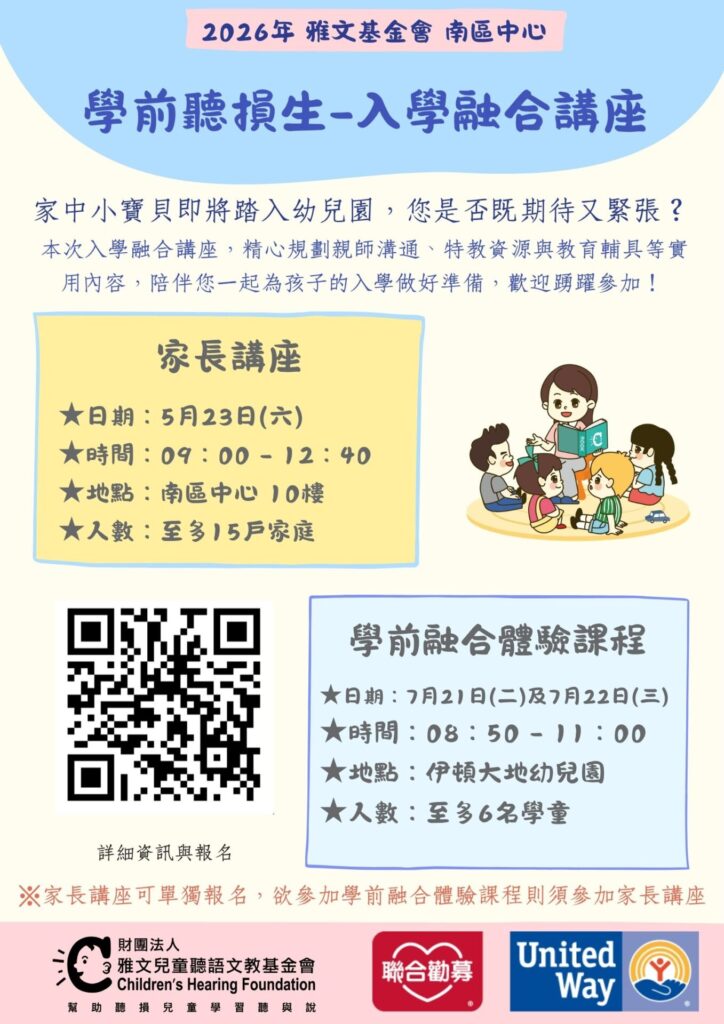 為了陪伴家長與聽損孩子安心迎接入學階段,雅文基金會將於 2026 年在高雄舉辦「學前聽損兒入學融合家長講座」及「校園融合體驗課程」。活動內容結合入學前的實用準備建議與實體幼兒園情境體驗,協助孩子提前熟悉學校環境、順利適應幼兒園生活。課程全程免費,並貼心提供育兒服務,讓家長能更安心參與。