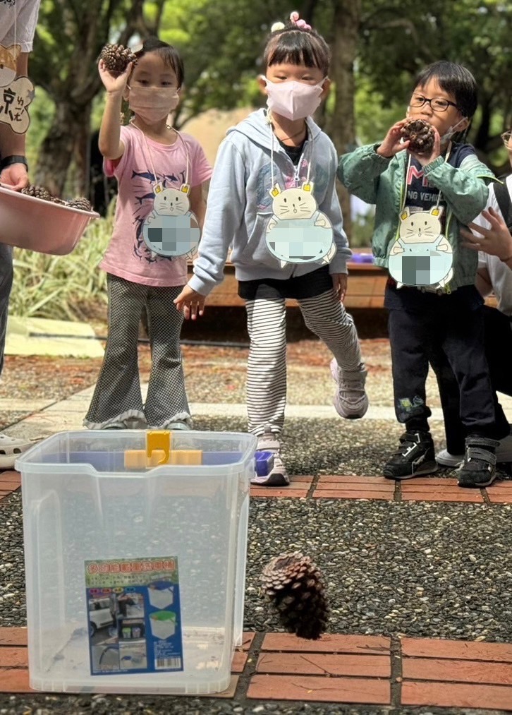 在「大自然探險」活動中,孩子們深入中原大學校園內搜尋各種植物,將蒐集到的大花咸豐草花瓣黏貼製作成書籤;將桃金釀的葉片插在黏土上製作成毽子,最後還利用松柏的毬果來一場刺激的投籃大賽!