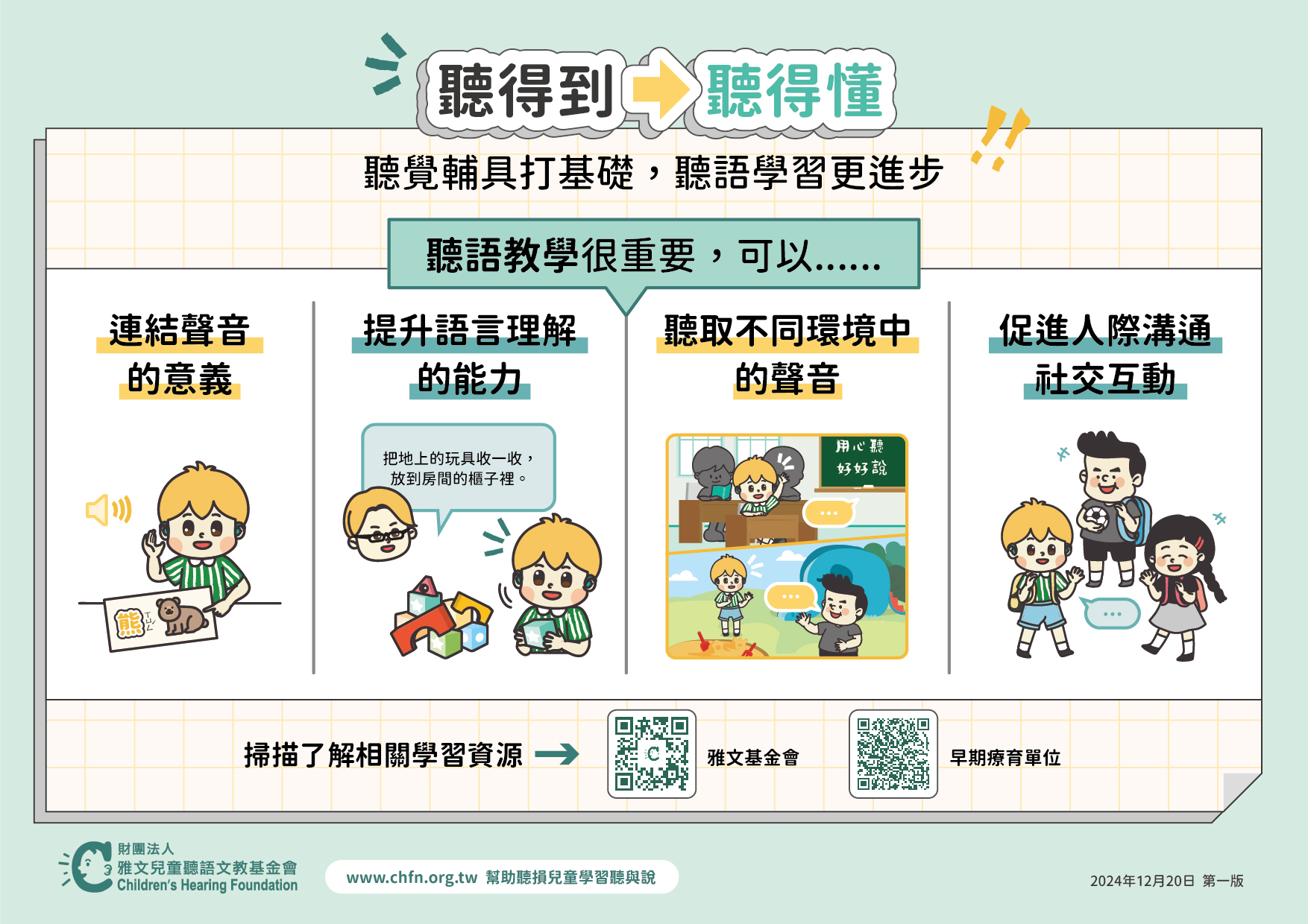 ● 原因:助聽器能放大聲音,但孩子仍需要學習如何「辨識聲音、理解語言」,並發展口語與溝通能力。