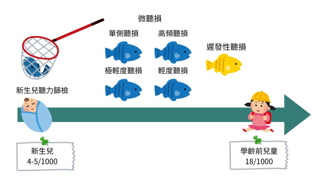 篩檢就像一個濾網,孔洞的大小就是通過的標準。通過標準的設定需要審慎決定,過於嚴格可能會導致許多聽力正常的新生兒沒有通過篩檢(偽陽性),造成新生兒家長不必要的恐慌及醫療資源的浪費,而過於寬鬆,又會遺漏掉許多真正有聽力損失的新生兒(偽陰性)。無論孔洞大或小,皆會有部份聽損的新生兒通過篩檢,這些孩子通常是(極)輕度聽損或高頻聽損,由於聽損程度在篩檢標準的邊緣,因此很可能會通過新篩。除此之外,相對於先天性聽損,還有一群孩子的聽力損失是遲發性的,也就是出生時聽力正常,當然也通過了新篩,但在1歲、2歲或任何時間點,才出現聽損的狀況,因此到了學齡前,聽損的比例會比新生兒時期更高(圖二)。綜合以上,新篩雖重要,但仍可能會遺漏這兩大類的孩子:微聽損與遲發性聽損。
