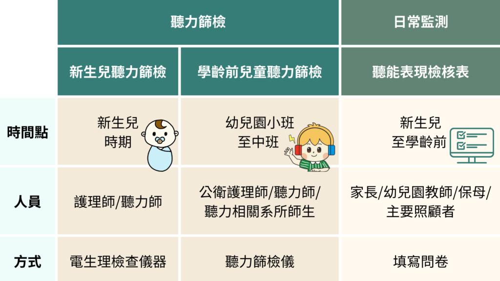 綜合以上,新篩、學篩兩大篩檢關卡,再搭配聽能表現檢核表,就如同一層層孔洞大小不同的濾網和篩子,在不同時間點、由不同人員以不同方式進行層層的把關(如表一),確保所有聽力損失的孩子,都能夠及早被發現,及早介入並進行療育。守護孩子的聽力健康,目前全面實施的新生兒聽篩是關鍵起點,再搭配學齡前聽篩與日常監測,更能確保不漏掉任何一個聽損孩子。